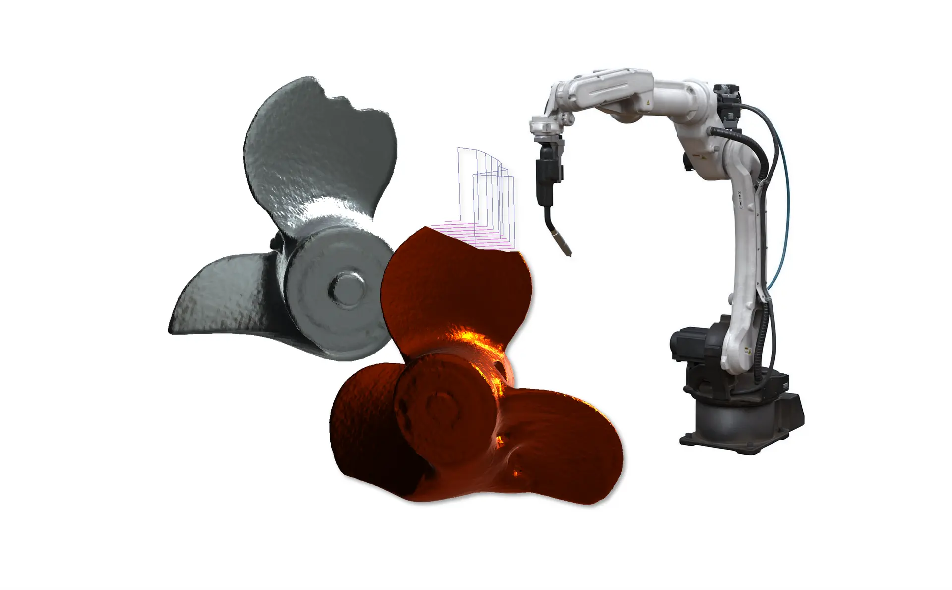 Automated hybrid repair of a damaged propeller, including pre-machining, additive manufacturing and surfacing.